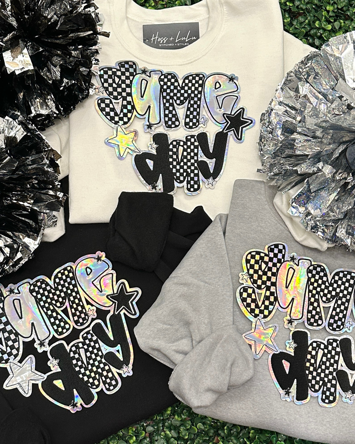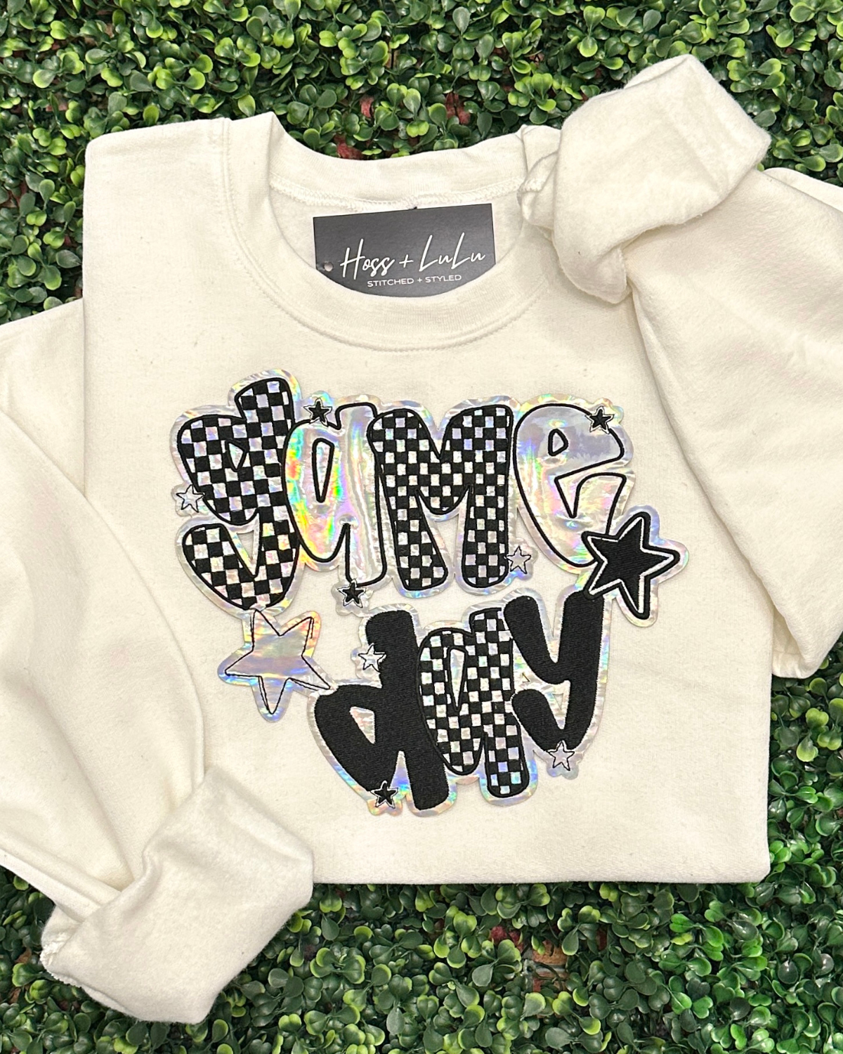 This sweatshirt features a large holographic checkered gameday patch that gives the perfect preppy mix of sporty and trendy. To purchase the patch only, please visit our Etsy shop @stitchedoriginals